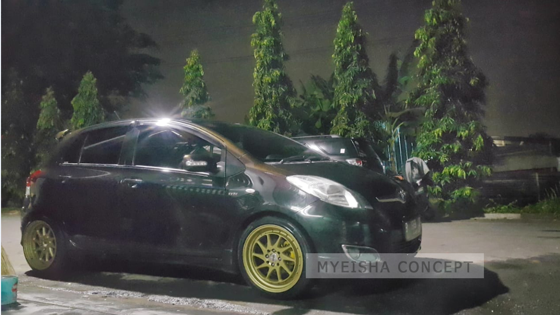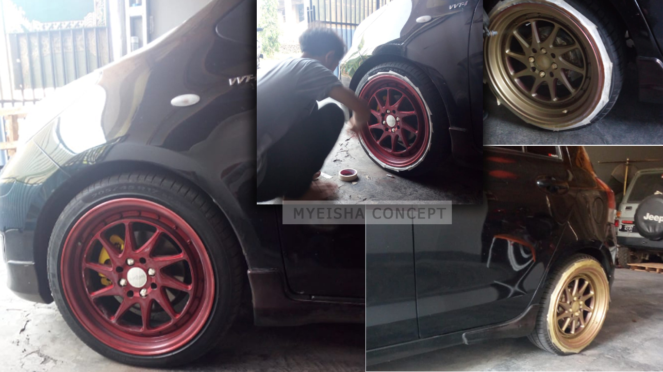 MYEISHACONCEPT. Velg Mobil Toyota Yaris sebelumnya berwarna merah candy. Warna yang cukup mentereng. Namun, atas permintaan si empunya, velg diubah warnanya menjadi pear gold.