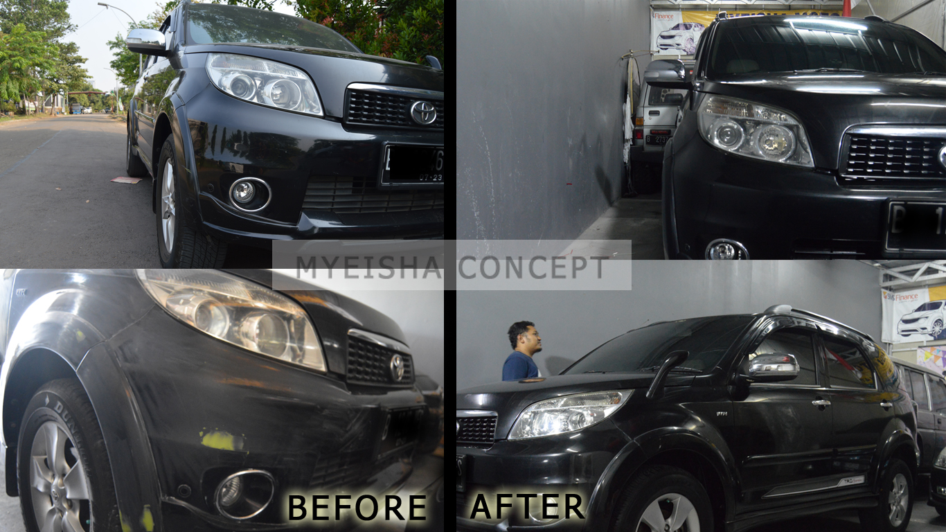 MYEISHACONCEPT. Mobil Rush hitam milik si Abang Gondrong mulai masuk bengkel pengecatan Myeisha Concept pada awal Juli 2019 lalu. Meskipun kondisi roda empat ini tampak bagus, namun perlu polesanan Bang B-wokz alias Abang Ody untuk menambah kekinclongannya, sehingga kelihatan gagah bila berselancar di jalan raya.
