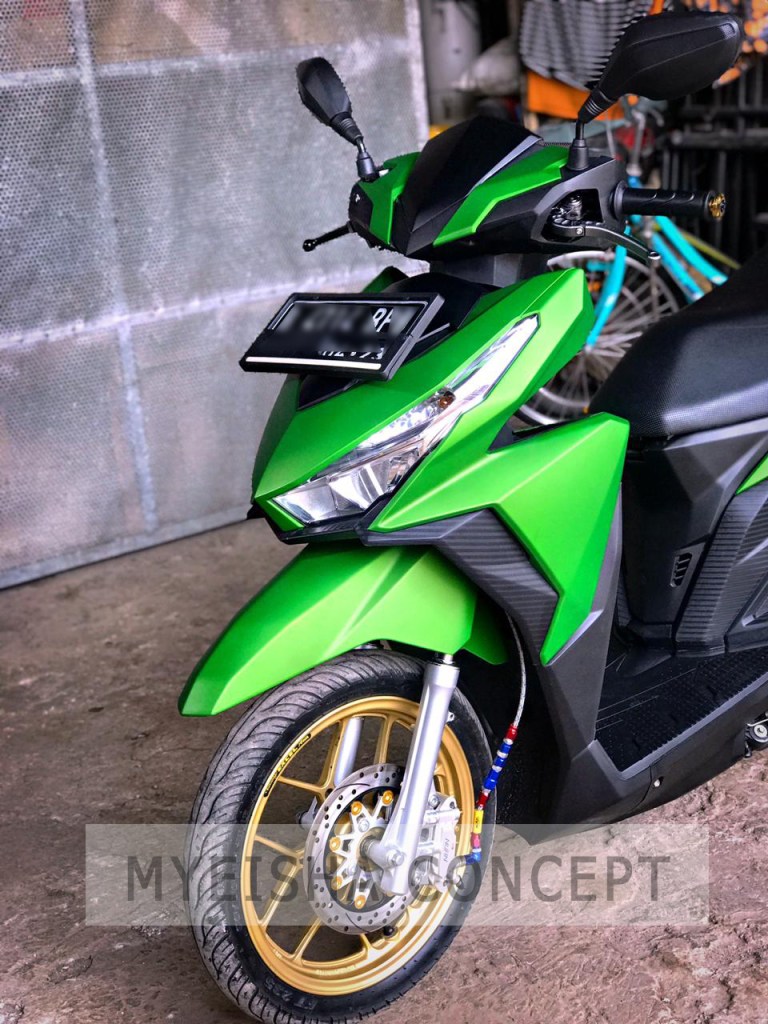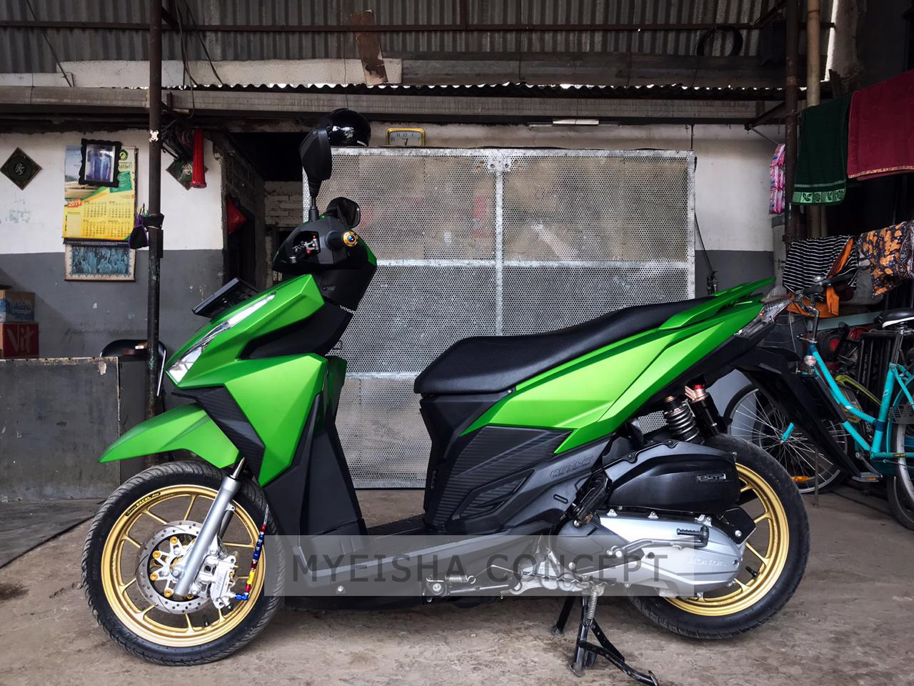 MYEISHACONCEPT. Penantian Abang Acong untuk memiliki motor berwarna lime green akhirnya terjawab sudah. Kini motornya yang bermerek Honda Vario Techno 125 eSP sudah terbungkus warna hijau di seantero bodinya.