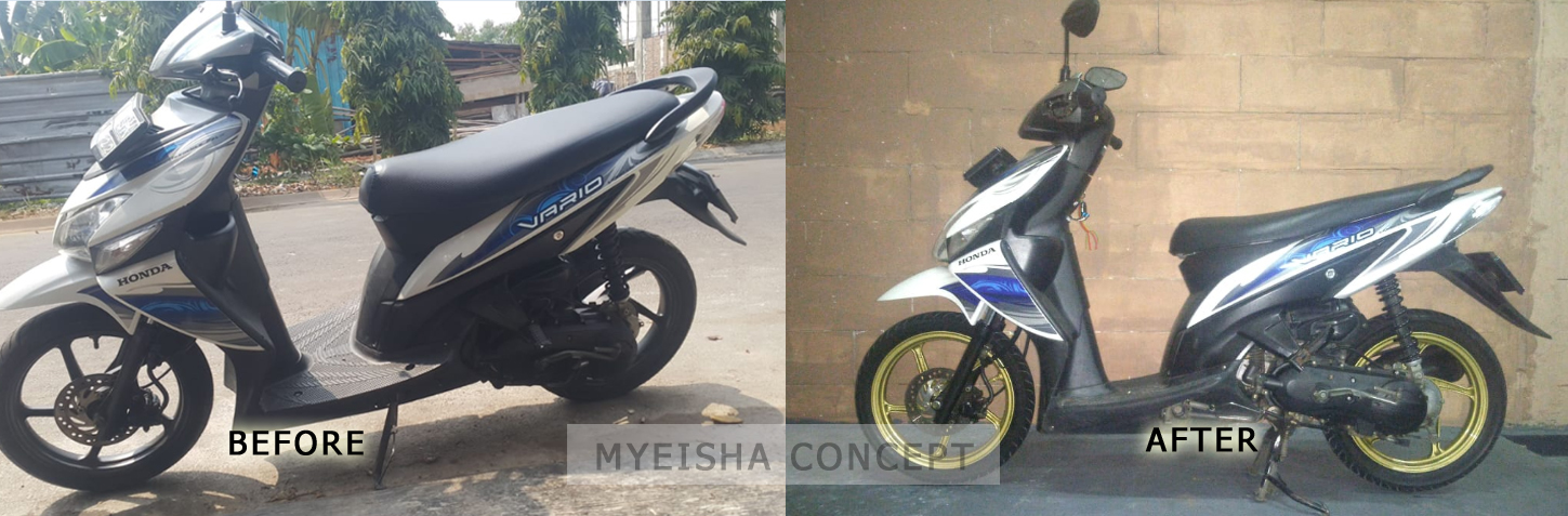 MYEISHACONCEPT. Semula, penampilan motor Honda Vario 110 milik Pak Hasan tampak biasa saja. Atau, kata orang kulon bilang terlihat original alias masih apa adanya. Namun, sekarang tongkrongan motor tersebut terkesan mewah nan elegan. Meskipun sejatinya tak banyak berubah, hanya penggantian pada warna velg atau rim. Motor Pak Hasan tiba di Bengkel Cat Myeisha Concept pada …